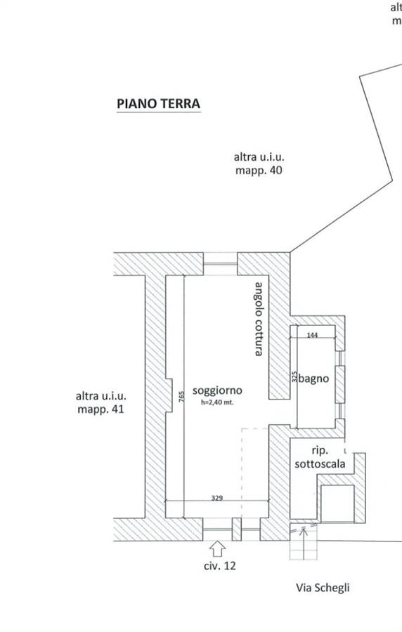 A) Appartamento a della superficie commerciale di 96,51 mq per la piena proprietà. Fabbricato avente accesso dal civ. 12 di Via Schegli. L’unità immobiliare si sviluppa come segue: - piano terra, avente altezza interna pari a mt. 2,40 circa, composto da soggiorno con angolo cottura, bagno e ripostiglio sottoscala avente accesso esterno nonché corte esclusiva. - piano primo, avente altezza interna variabile da mt. 2,40 a mt. 3,95 circa, composto da disimpegno, n° 2 camere, bagno. Attualmente i due piani sono collegati da una rampa costituita da assi in legno da cantiere; ad ogni buon conto si evidenzia che il piano primo è altresì accessibile a mezzo di scala esterna. I caratteri di finitura dell’unità immobiliare, rilevati al momento del sopralluogo (trattandosi di cantiere in itinere) consistevano in: pavimenti e pareti al grezzo ed impianti inesistenti; gli infissi (finestre) risultavano in legno e vetro camera e parte di tali infissi risultano completi di scuri in legnoIn generale le condizioni di manutenzione e conservazione e i caratteri di finitura interni dell’unità immobiliare risultano al grezzo e da completarsi.